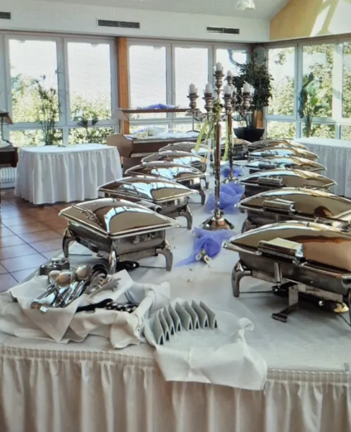 Dank unserer großen Küchencrew von über 30 Mitarbeitern haben wir die Möglichkeit Ihnen eine sehr große Bandbreite zu bieten – Spießbraten vom Grill, Fingerfood-Buffet, deftiger Eintopf, Suppenbar, eine große Auswahl an Buffets oder ein serviertes 5-Gang-Menü.
